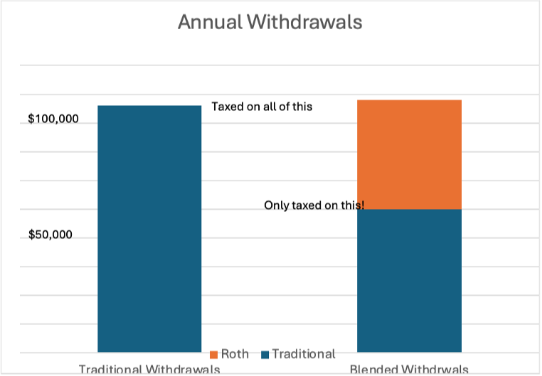 The way to hedge against unplanned fluctuations in retirement expenses is a strategy called “tax diversification”, whereby a retiree pulls a base amount out of their traditional accounts and uses their Roth accounts to cover the irregular expenses like $60,000 medical events. Click here for details on the differences between IRAs and Roths. This ensures they get to take care of the big-ticket items that come up and continue to keep their income flat so they don’t end up in a higher tax bracket. The table below illustrates the idea.