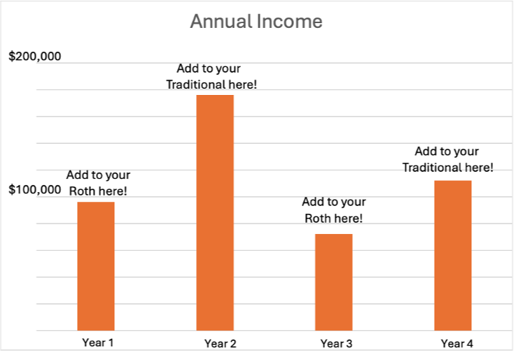 To help understand the graph, above, say in year 1 a couple’s income dropped because the family’s breadwinner had to take three months off to recover from a knee surgery. That time off temporarily lowered household income which means the couple is in a lower tax bracket. Since they’re in a lower tax bracket, they may be better off contributing to a Roth to create a tax-free bucket of money during their retirement years. Now let’s say in year two, the same couple had both partners working full time and they both received a substantial bonus that year. If they both maxed out their 401(k)s at work, they could defer $49,000 of their annual income and significantly lower their tax bill. These same strategies can be used in years 3 and 4. Over the course of a 40-year career can lead to substantial savings.